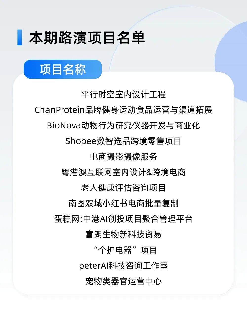 本次路演项目领域多元,广泛覆盖室内设计、跨境电商、AI创新、大健康、宠物等当下热门行业。各项目团队紧跟时代潮流,精准把握市场需求,展现出对行业发展的深刻理解和独特见解。