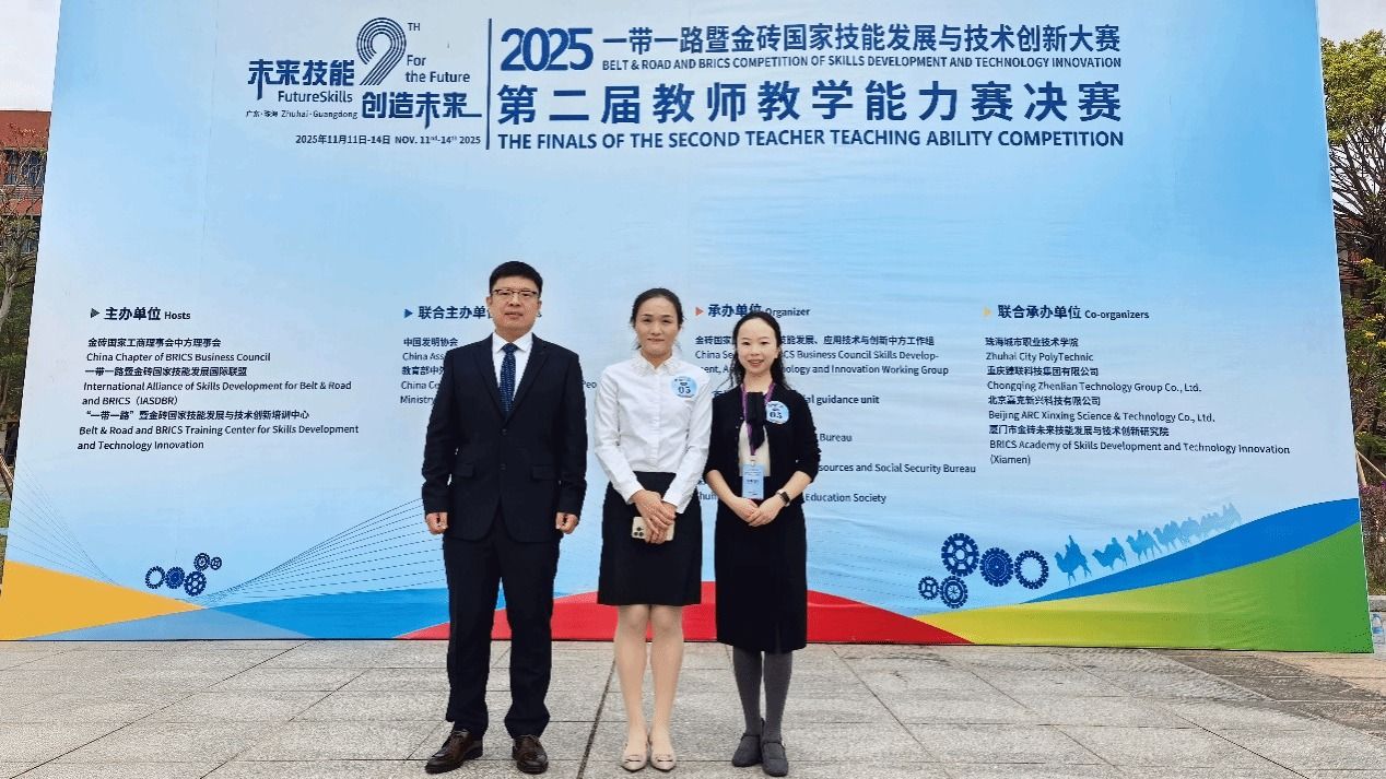 182025.1111月11日-11月14日,2025“一带一路”暨金砖国家技能发展与技术创新大赛第二届教师教学能力大赛决赛在珠海城市职业技术学院举行。我校由高志强、孙惠芳、唐楸琳三位老师组成的参赛队伍“包行天下”经过选拔赛和决赛,最终获得制造工程技术赛道一等奖。【颁奖现场照片,“包行天下”团队代表高志强老…