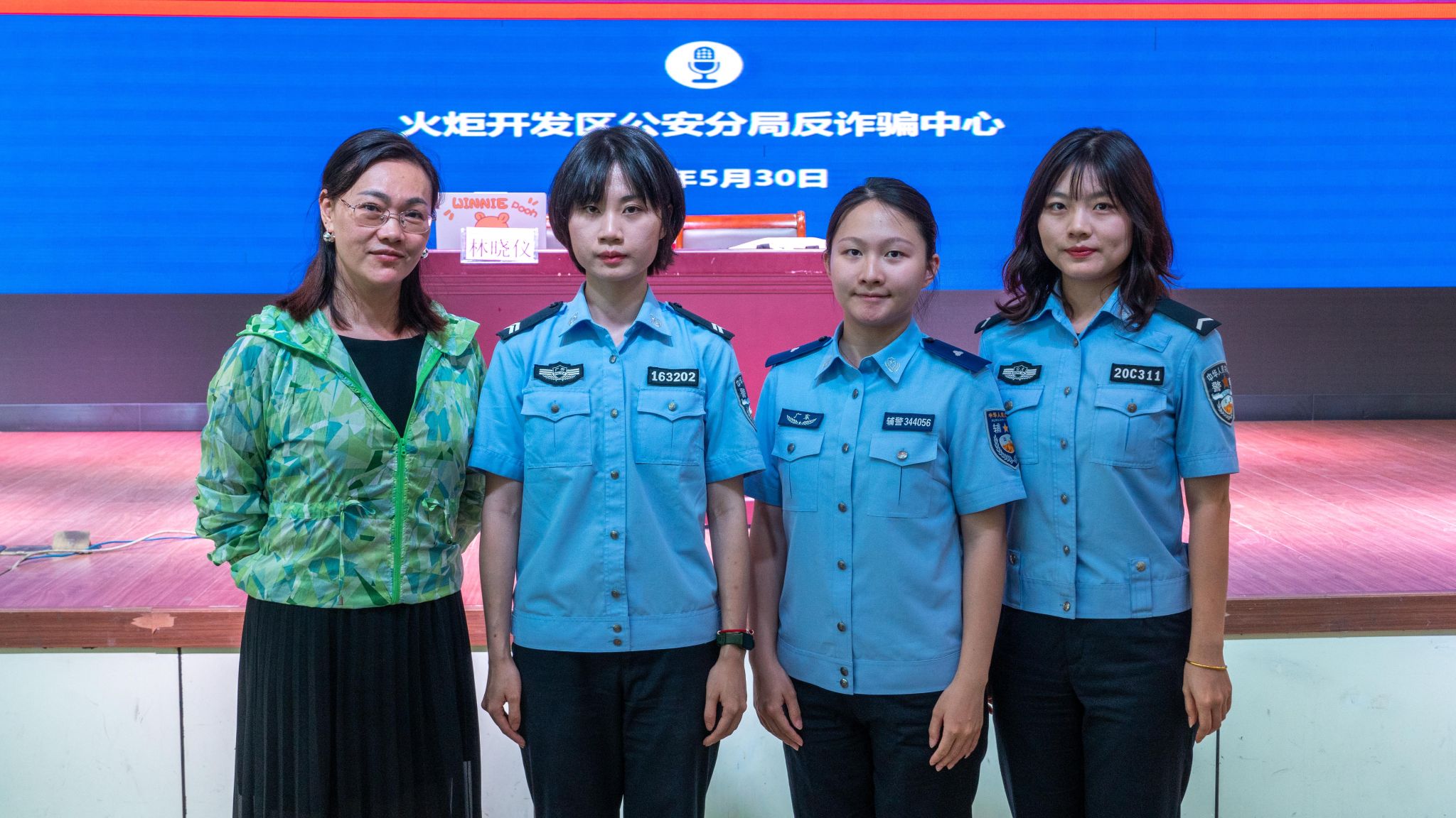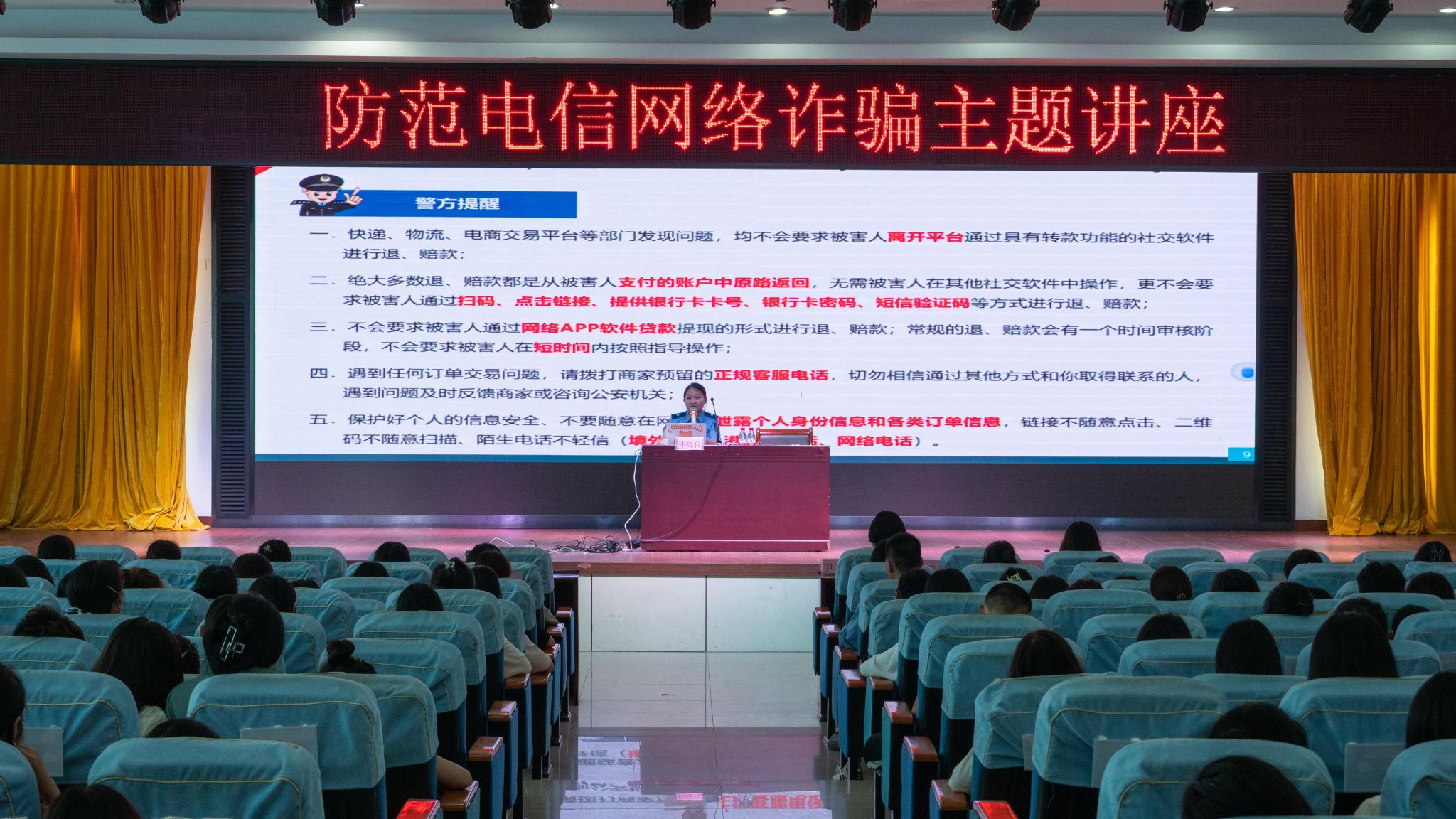 为了全面深入推动和落实学校安全教育工作,切实保护学生人身、财产安全,提高学生安全防范意识与自我保护技能,有效杜绝诈骗案件的发生,学生工作部特邀请中山市公安局开发区分局反诈中心防诈讲师团到校开展防范电信网络诈骗主题讲座。本次讲座由尹嘉钰、林晓仪两位警官分两场主讲,区分局防诈中心谢梓欣警官、学生工作部(武装部)李蠲老师及500余名学生代表参加了讲座。