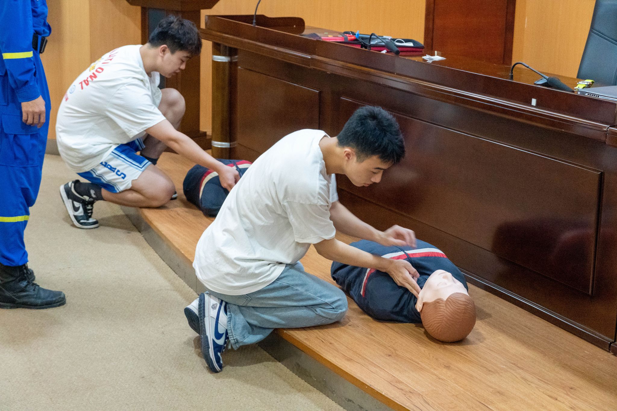 活动中,蓝天救援队两位老师从理论培训和实践操作两个角度为在场同学带来了精彩授课。在理论培训中,蓝天救援队成员为大家讲述了有关意外伤害的应对措施,结合自身救援经验向学生展示了关于溺水、中暑、烧烫伤、防暴等情况的紧急救护措施。