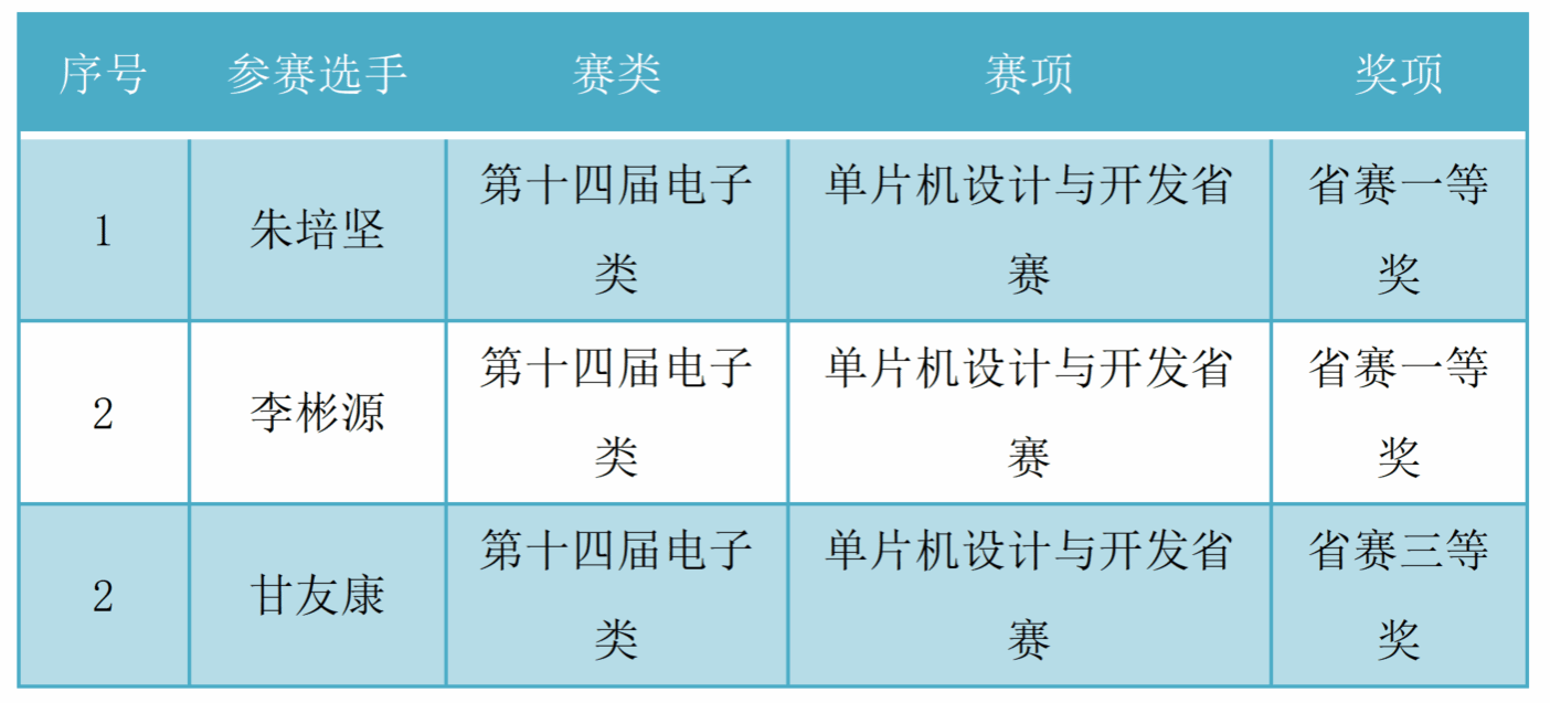 近年来,装备智造学院积极开展人才培养模式改革,围绕学生德智体美劳全面发展目标,构建全员参与、全过程、全方位的大思政育人生态环境,创建具有装备智造特色的匠心养成教育课程体系,培养“德技并修”社会主义工匠。为了准备本次比赛,指导教师通过前期的动员、组织和精心指导,最后选拔出3名学生参加该赛项的广东省选拔赛,3名选手均顺利完成电子类竞赛科目比赛,并全部获奖。省赛获奖学生名单如下: