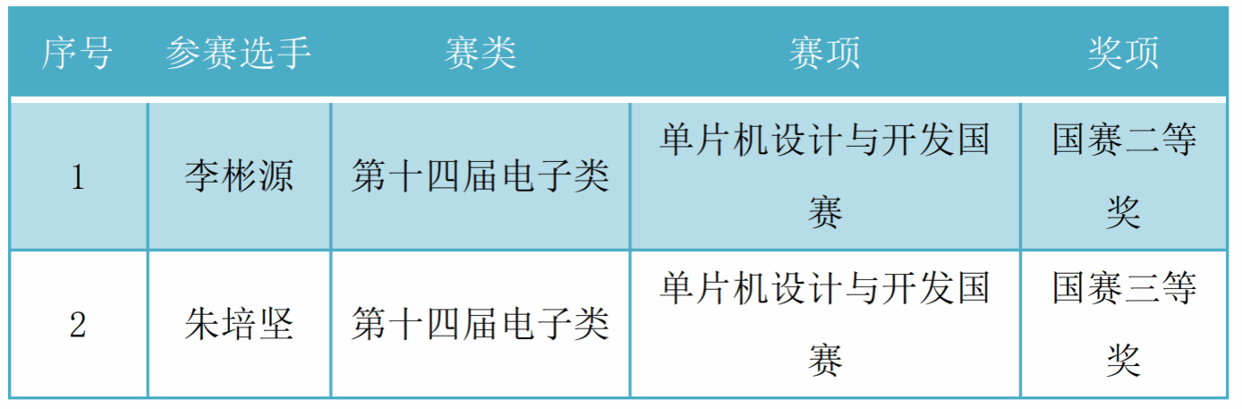 今年6月,第十四届蓝桥杯全国软件和信息技术专业人才大赛个人赛全国总决赛成功举办。学校装备智造学院2名学生顺利完成电子类竞赛科目比赛,展现了自己的专业实力,获得全国赛二等奖1项、三等奖1项的佳绩。国赛获奖学生名单如下:
