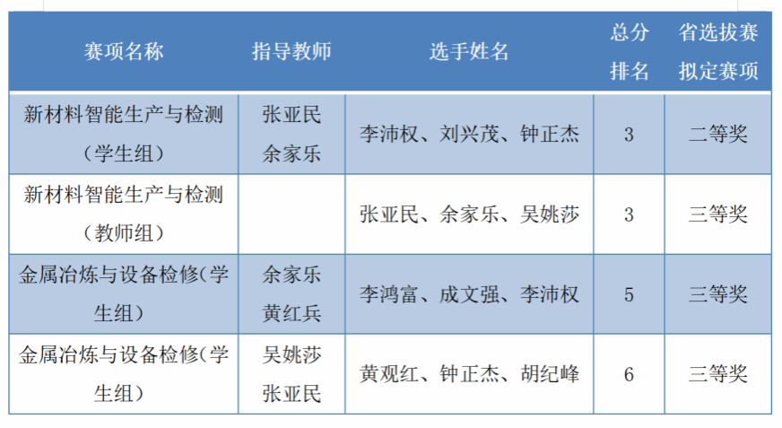 日前,2022-2023年度广东省职业院校学生专业技能大赛基本结束,我校参与“新材料智能生产与检测”和“金属冶炼与设备检修”的两个赛项获得二等奖1项、三等奖3项。