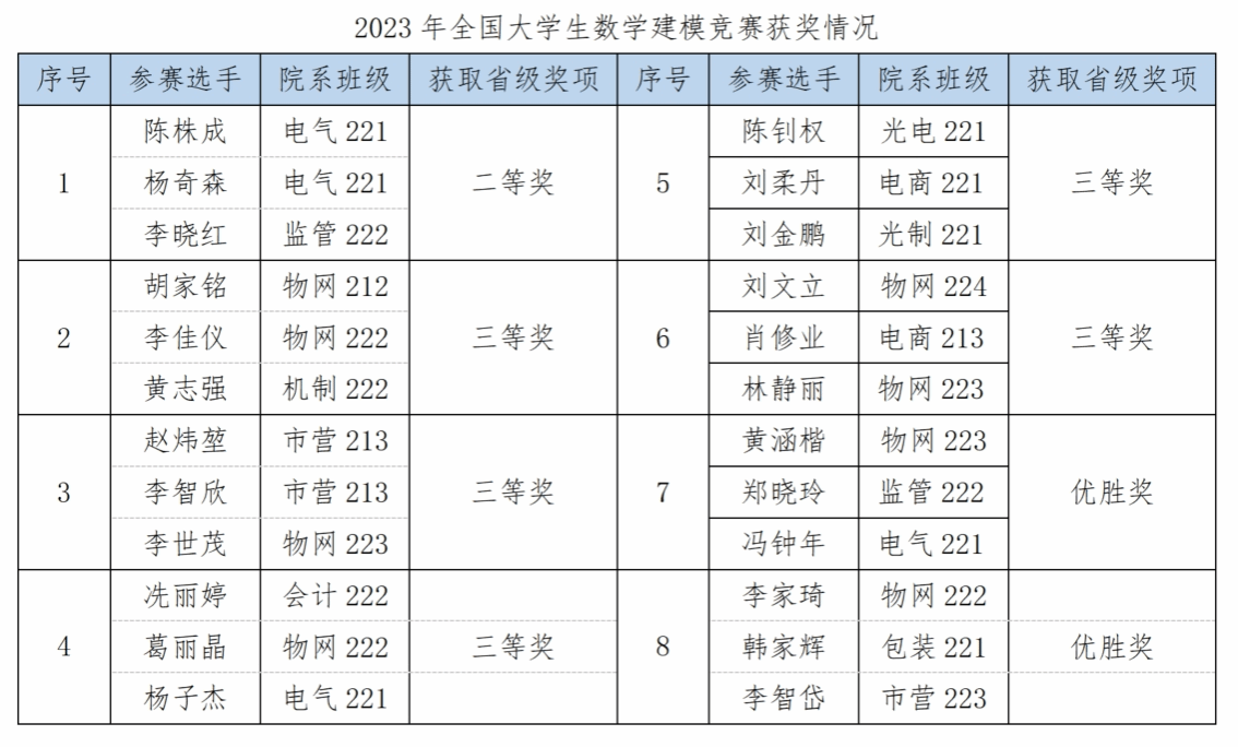 由广东省教育厅和中国工业与应用数学学会主办的“2023年全国大学生数学建模广东省分赛”成绩于近日揭晓,我校学生在此次比赛中再创佳绩,共收获省级二等奖1项,三等奖5项和优胜奖2项。