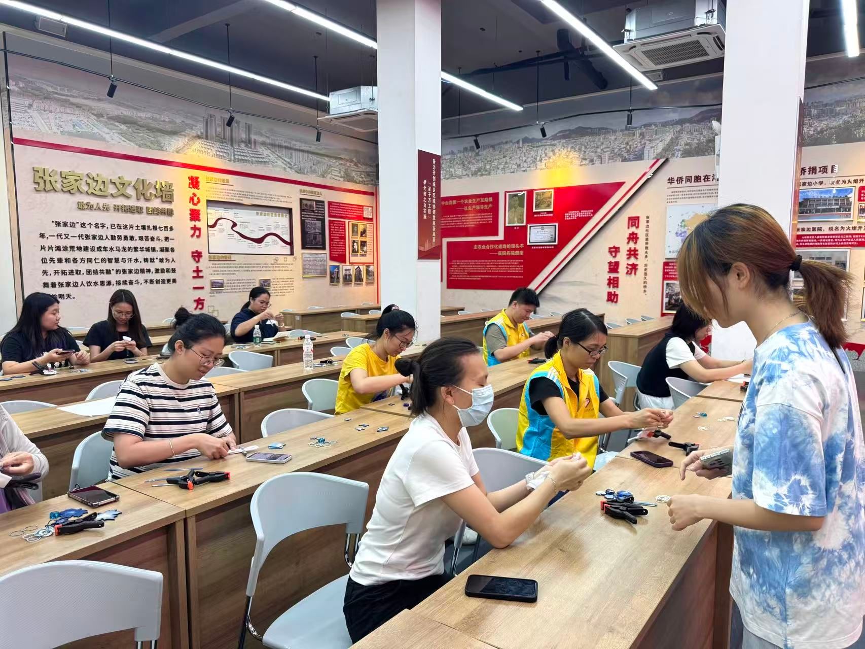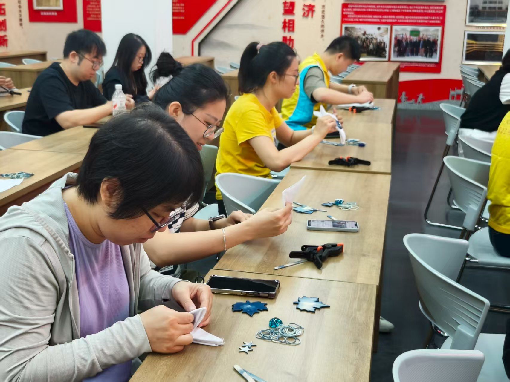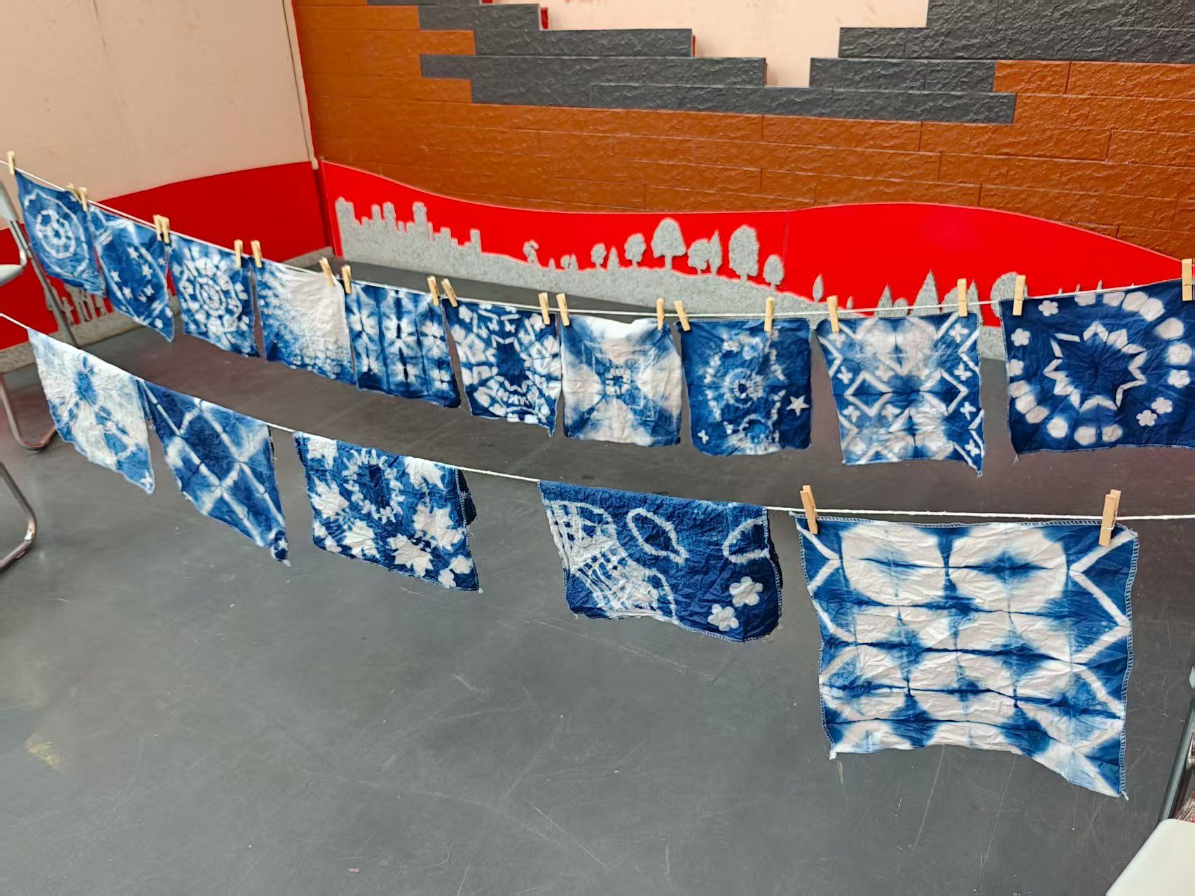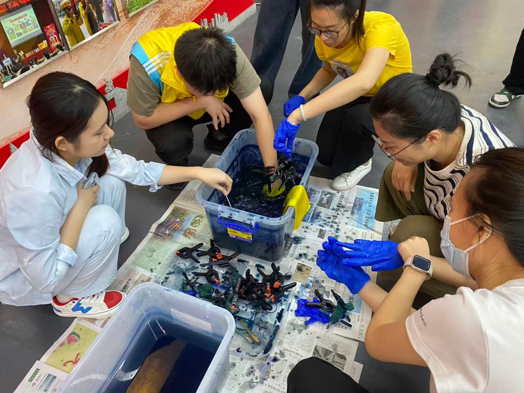 进入实操环节,居民们在讲师指导下,手持素白棉布,运用折叠、捆绑、打结等手法创造个性化纹样。随着布料浸入靛蓝染缸,大家凝神期待色彩在布面上逐渐蔓延。作品揭晓那一刻,蓝白交错、水墨画般的纹理引来阵阵赞叹。居民纷纷举起自己独一无二的扎染作品合影,脸上洋溢着成就感和喜悦。