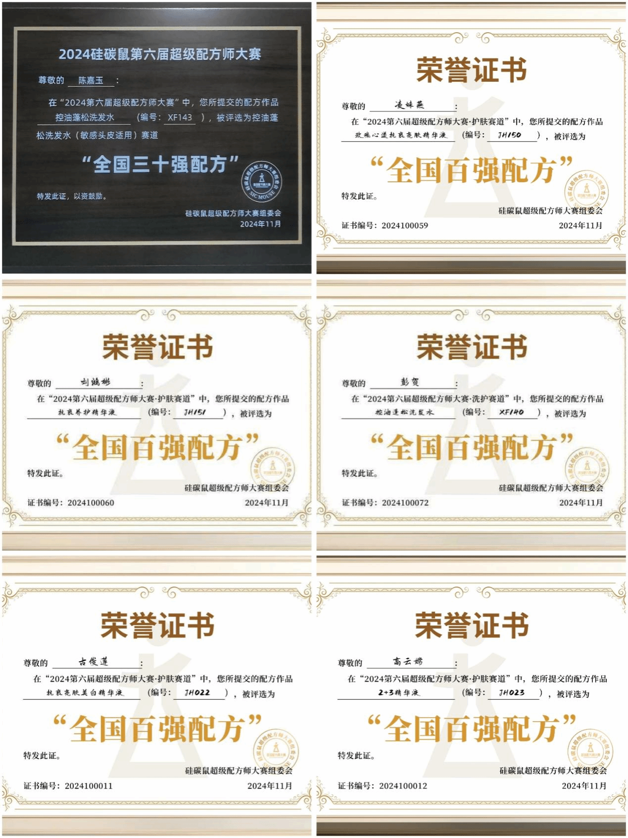 【2024年化妆品硅碳鼠配方师大赛所获奖项】