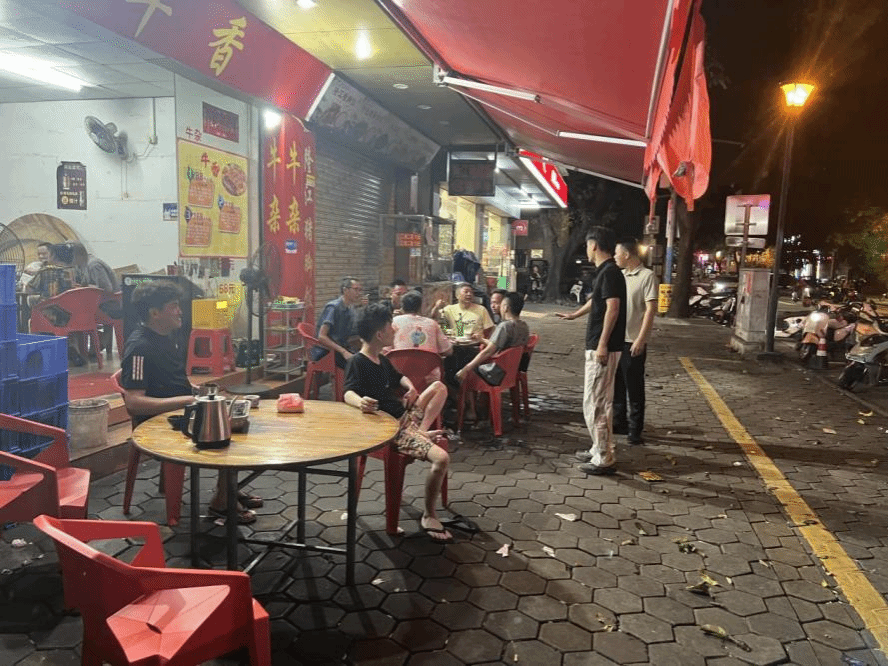 【贾昊楠(右二)在台风前夕劝导食客尽快回家】