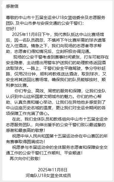 11月8日,河南U18女篮队因队员的比赛球衣遗落酒店,向十五运会志愿者和公安干警求助。来自我校的志愿者迅速协调,公安干警马上用警车护送教练取回球衣,全程仅用了28分钟,确保球队顺利参赛。河南队对志愿者和公安干警的专业高效服务表示诚挚感谢,盛赞他们展现了全国文明城市的魅力与温度,也让球队对十五运会各项保障工作充满信心。