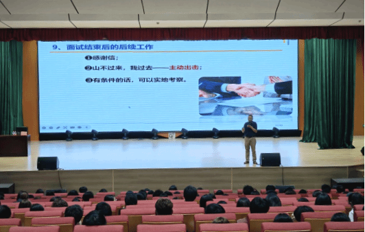 雷玉良老师拥有15年大型上市公司HR管理实战经验,他在讲座中围绕就业观念、简历制作、招聘平台选择、面试技巧、就业协议签订及就职初期职业规划展开讲解,强调“量力而行、精准定位、主动求职”。他还讲解了就业协议签订注意事项,寄语同学们工作前五年以积累经验、提升能力为核心,做到“专业可不对口,但能力必须匹配”。