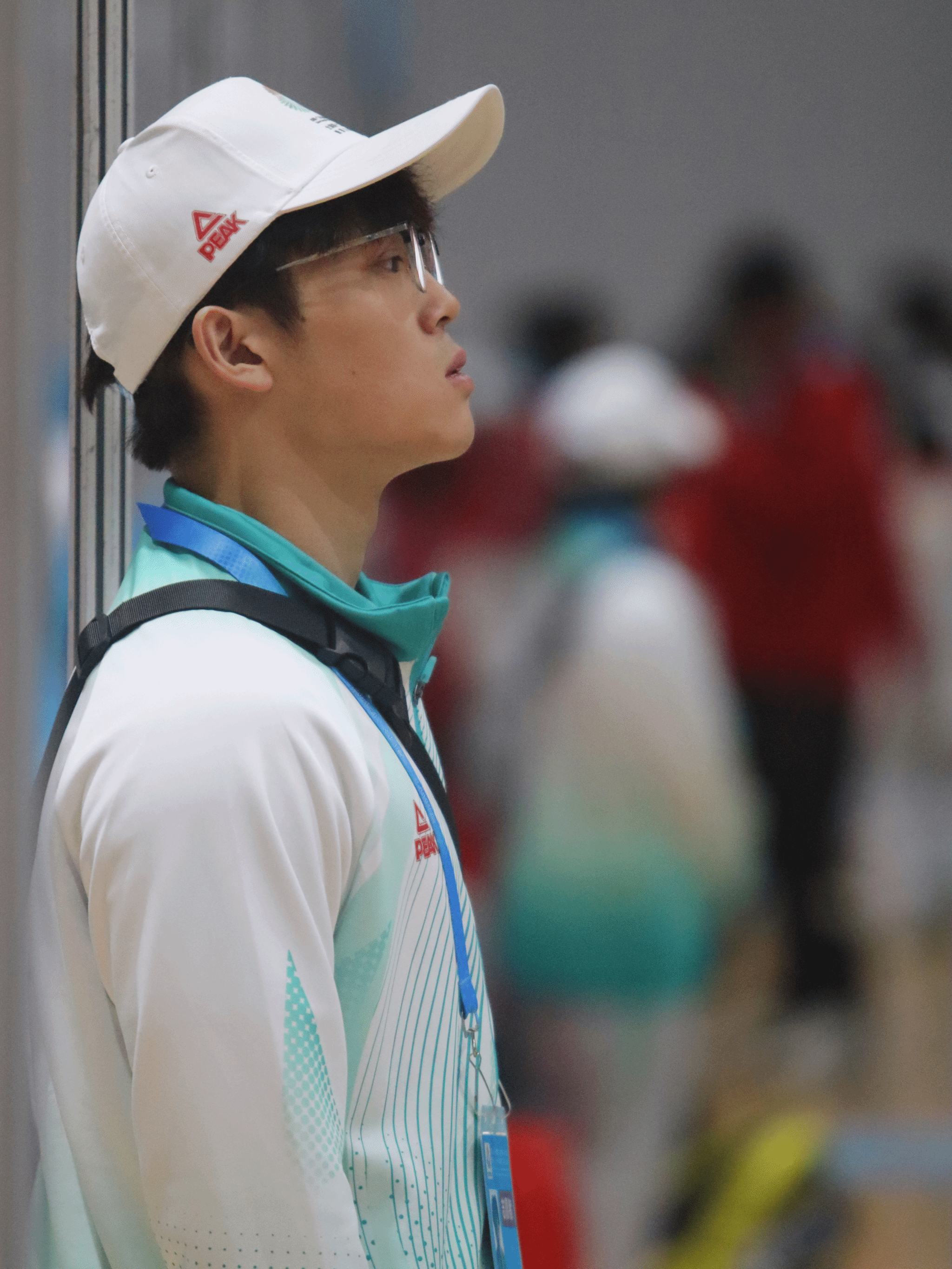 寇家橦在赛场边注视运动员们比赛,以防需要及时上前提供帮助