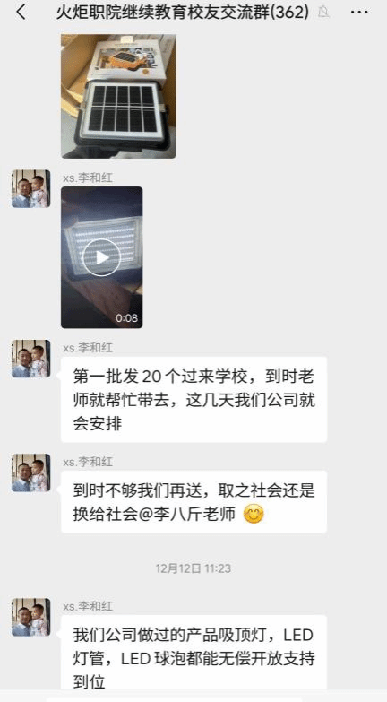 自我校选派继续教育学院的李八斤老师到凤凰镇开展驻镇乡村振兴帮扶工作以来,得到了广大校友的持续关注与支持。李和红校友表示,作为火炬职院培养的学子,他始终铭记母校“立德、明志、精业、惟新”的校训,得知我校教师在凤凰镇开展驻镇帮扶工作后,便迅速筹备适配乡村场景的便携式太阳能灯,希望以绵薄之力改善困难群体生活条件。同时他还表示,今后会继续开展相关捐赠活动,感恩学校的培养和尽力回报社会。