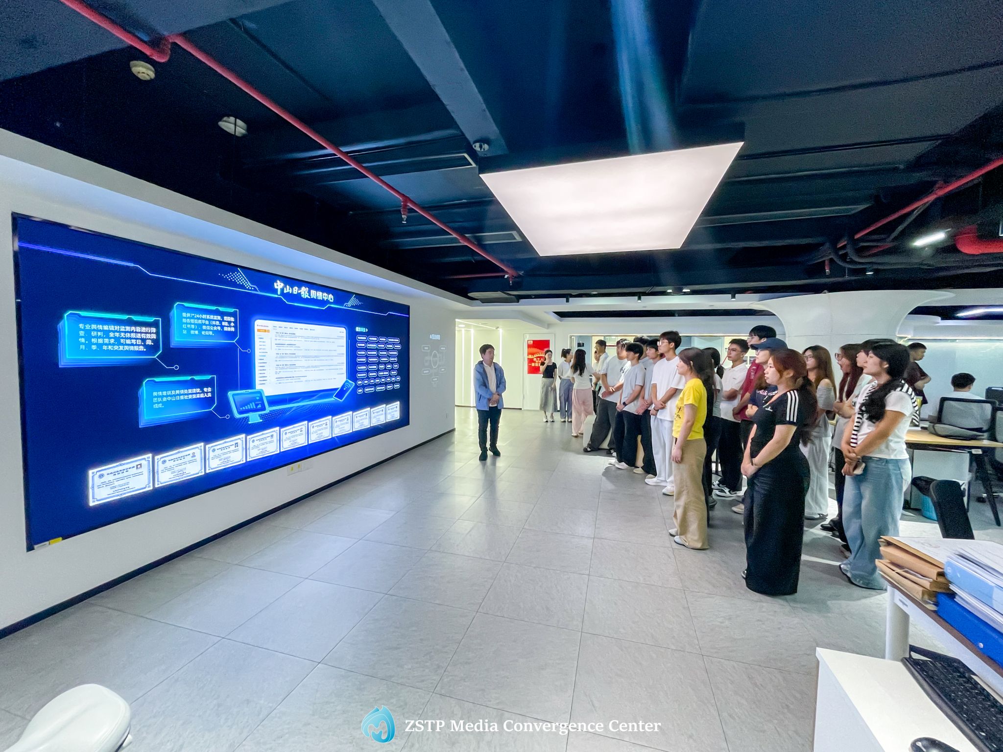 同学们参观了中山网的办公区域,近距离了解融媒体采编、内容运营等日常工作场景。现场特别设置了AI互动大屏演示环节,生动展示了网络安全知识和舆情监测分析的实战应用,让同学们直观感受到人工智能技术在媒体传播与风险防控中的重要作用。