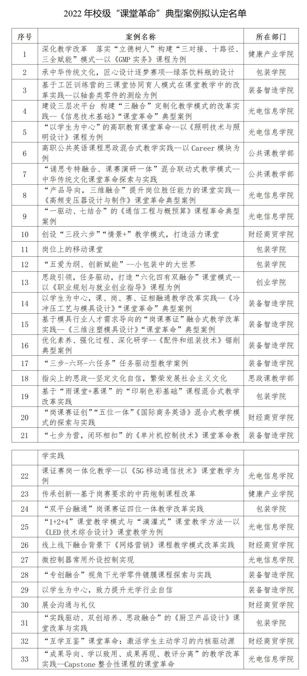 根据学校《关于开展2022年校级“课堂革命”典型案例认定申报工作的通知》(教务通字〔2022〕62号)精神,经个人(团队)申报,二级学院(教学部)推荐,教务处审查,校外专家评审,结合申报数量情况,拟认定《深化教学改革 落实“立德树人” 构建“三对接、十路径、三全赋能”模式--以《GMP实务》课程为例》等33个案例为2022年校级“课堂革命”典型案例(具体名单见附件《2022年校级“课堂革命”典型案例拟认定名单》),现予公示,公示时间2022年11月30日至12月4日。