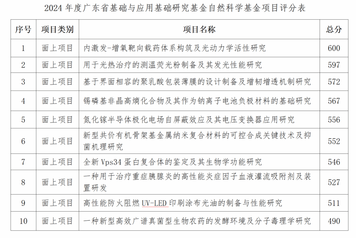 根据《广东省基础与应用基础研究基金委员会关于组织申报2024年度广东省基础与应用基础研究基金自然科学基金项目的通知》(粤基金函字〔2023〕14号),学校共收到10份项目申报,并组织校外专家对申报项目进行评审,现将项目评分予以公示,公示时间从2023年6月21日至2023年6月23日。