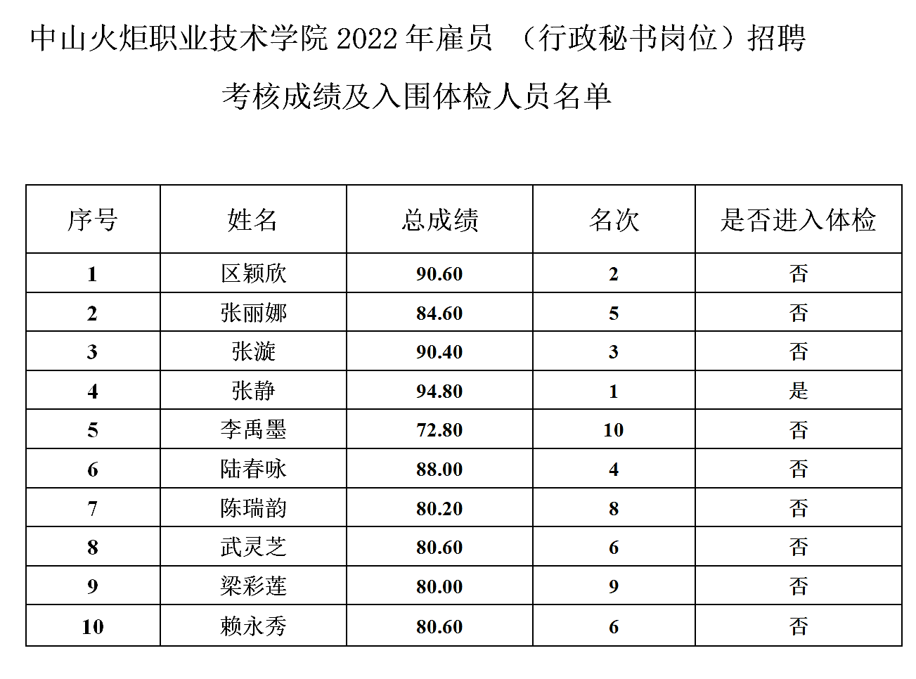 附件下载: 中山火炬职业技术学院2022年雇员 (行政秘书岗位)招聘考核成绩及入围体检人员名单.docx