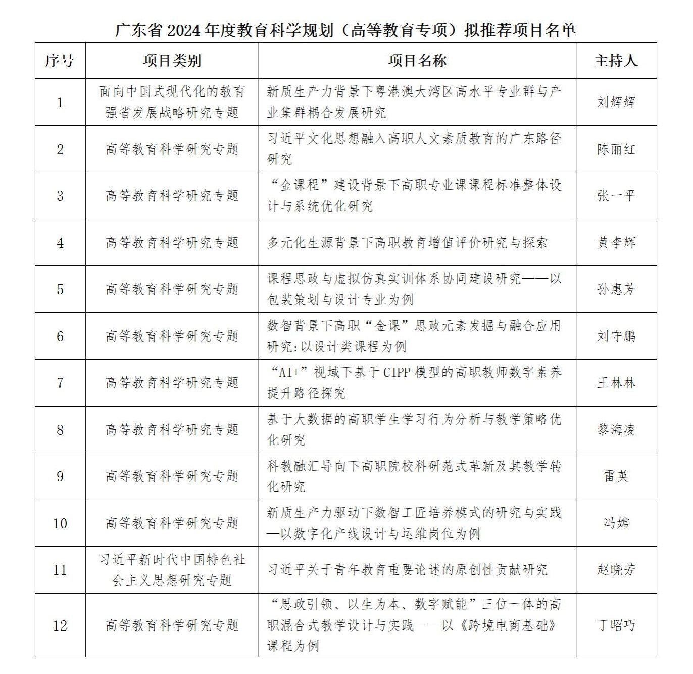 根据《广东省教育科学规划领导小组办公室关于组织申报2024年度教育科学规划项目(高等教育专项)的通知》要求,截止申报期共收到申报项目30项,学校组织校外专家进行评审,现将拟推荐项目(学校推荐限额12项)予以公示,公示时间从2024年6月11日至2024年6月13日。