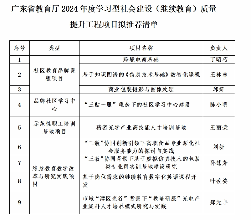 根据《广东省教育厅关于开展2024年度学习型社会建设(继续教育)质量提升工程项目申报工作的通知》要求,继续教育学院组织了“广东省教育厅2024年度学习型社会建设(继续教育)质量提升工程项目”申报工作,并聘请校外专家对17个项目申报材料进行遴选性评审。根据评审结果,拟向省教育厅推荐9个项目,现予以公示,公示时间从2024年5月25日至2024年5月29日。