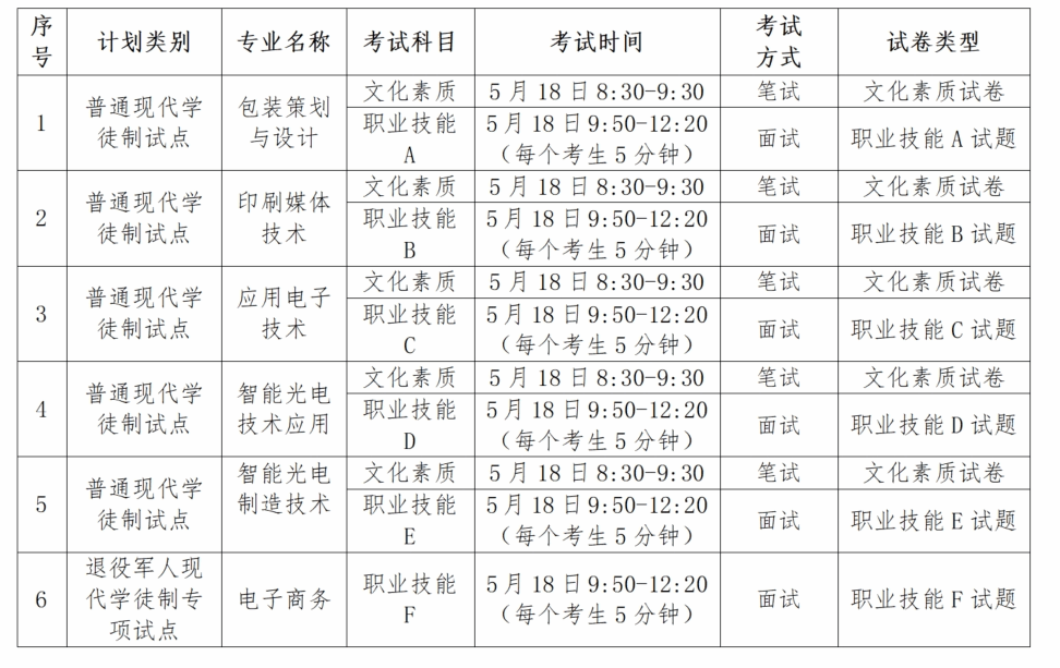 (3)试卷总分:普通现代学徒制试点专业60分,退役军人现代学徒制专项试点专业100分;