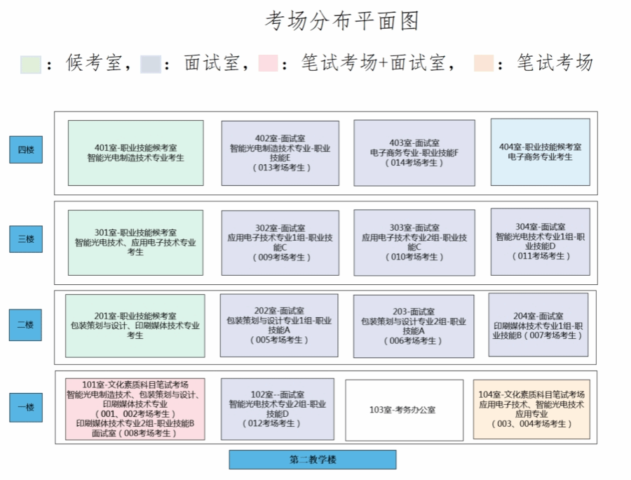 2024年我校自主招生考试地点为第二教学楼(具体见考场分布平面图),各专业考试安排如下表: