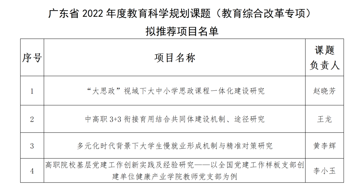 根据《广东省教育科学规划领导小组办公室关于开展2022年度教育科学规划课题(教育综合改革专项)申报工作的通知》要求,学校组织了校外专家对我校申报项目进行评审,现将拟推荐项目予以公示,公示时间从2022年7月5日至2022年7月7日。
