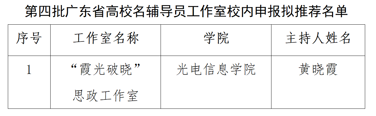 根据广东省教育厅《关于开展第四批广东省高校名辅导员工作室申报工作的通知》要求,结合学校2024年辅导员工作室申报结果,经学生工作部审核,拟推荐光电信息学院黄晓霞同志申报参评第四批广东省高校名辅导员工作室,现予以公示。