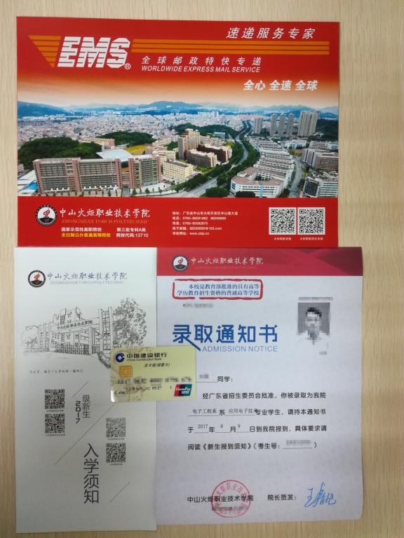 录取通知书内含一张中山建设银行的银行卡、一份《入学须知》、一张录取通知书,如下图所示: