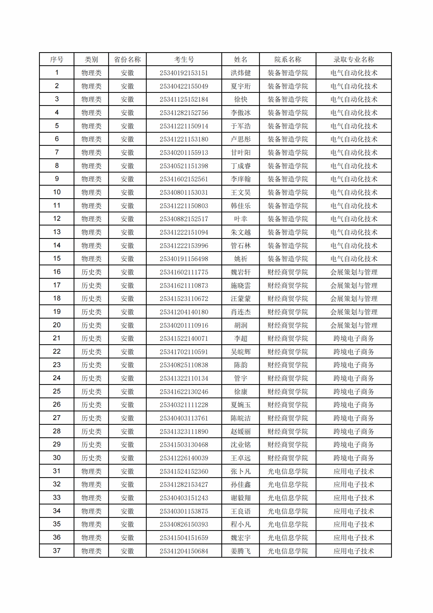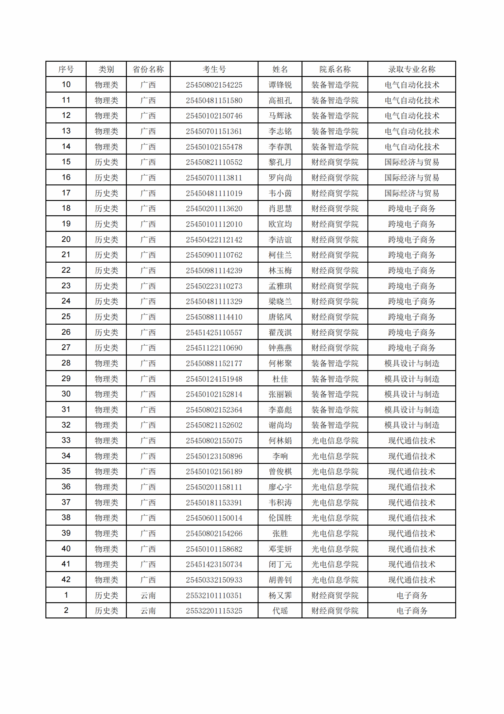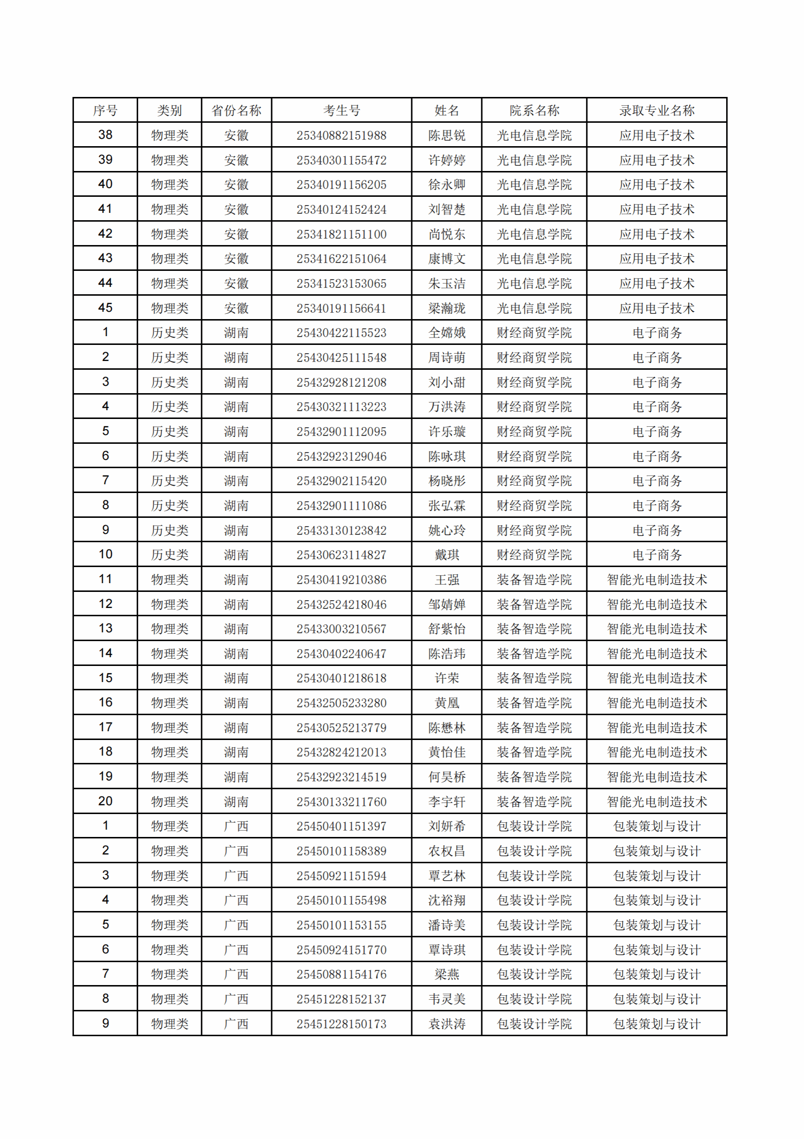 中山火炬职业技术学院2025年安徽省、广西壮族自治区、湖南省、云南省夏季高考录取名单