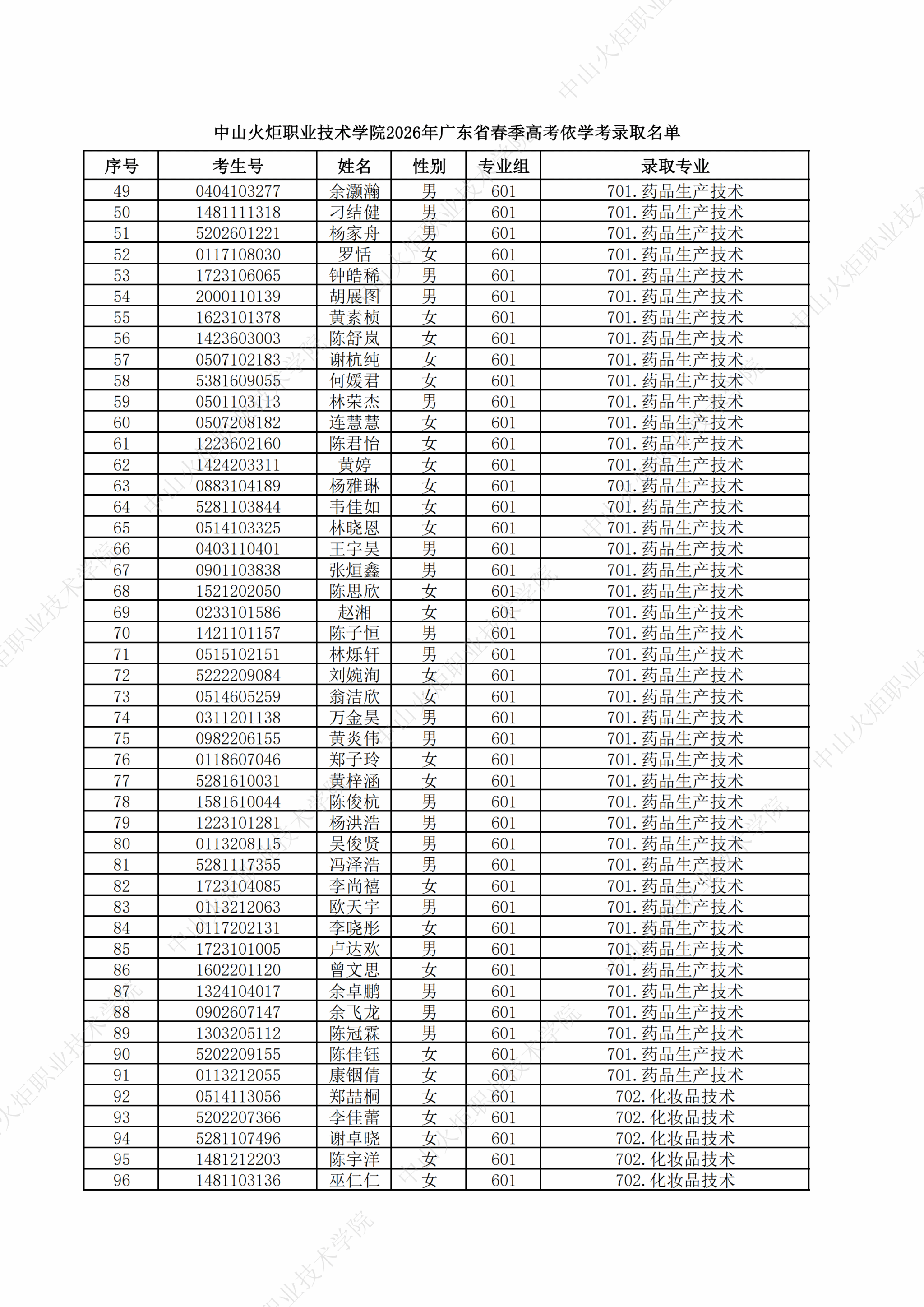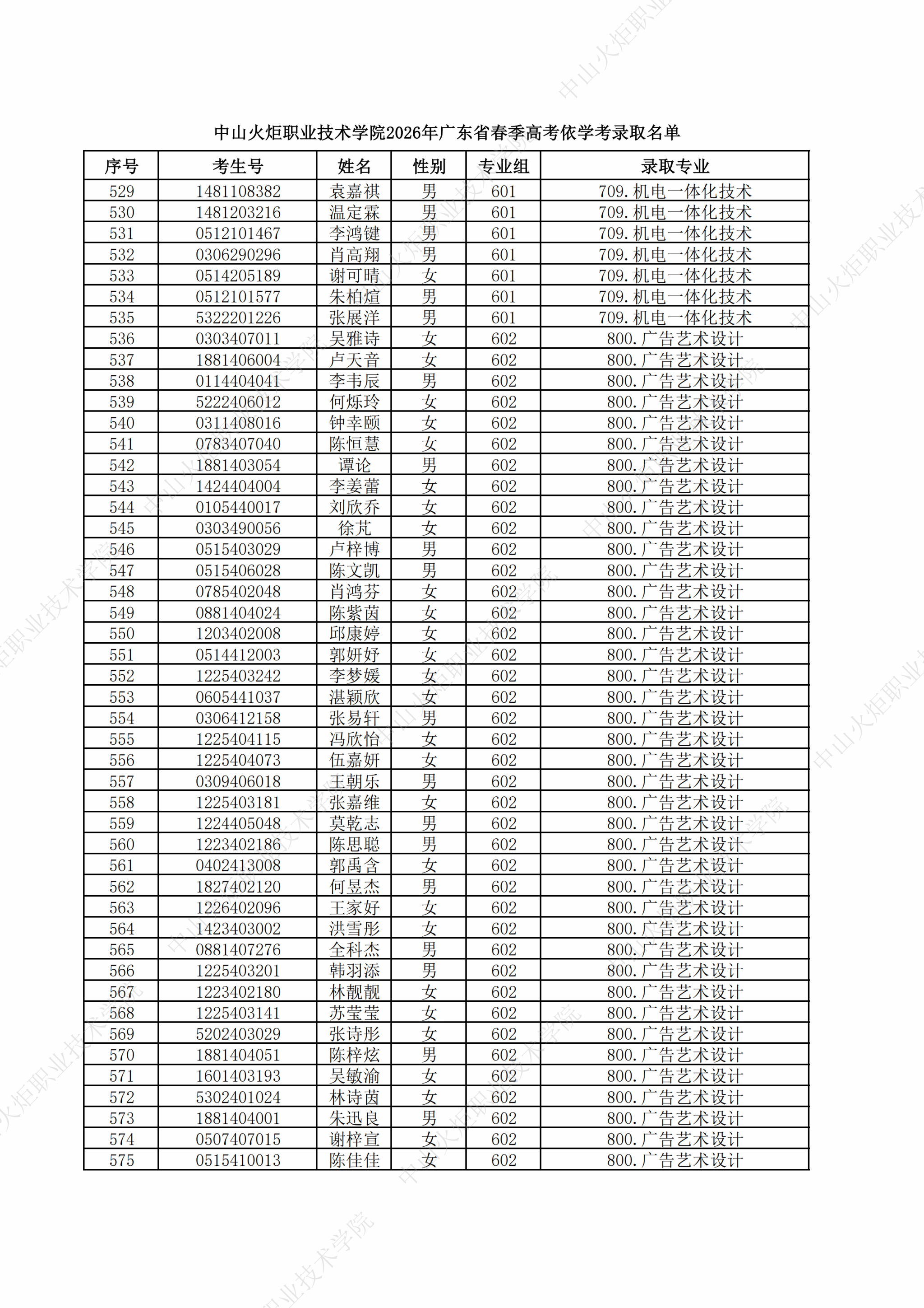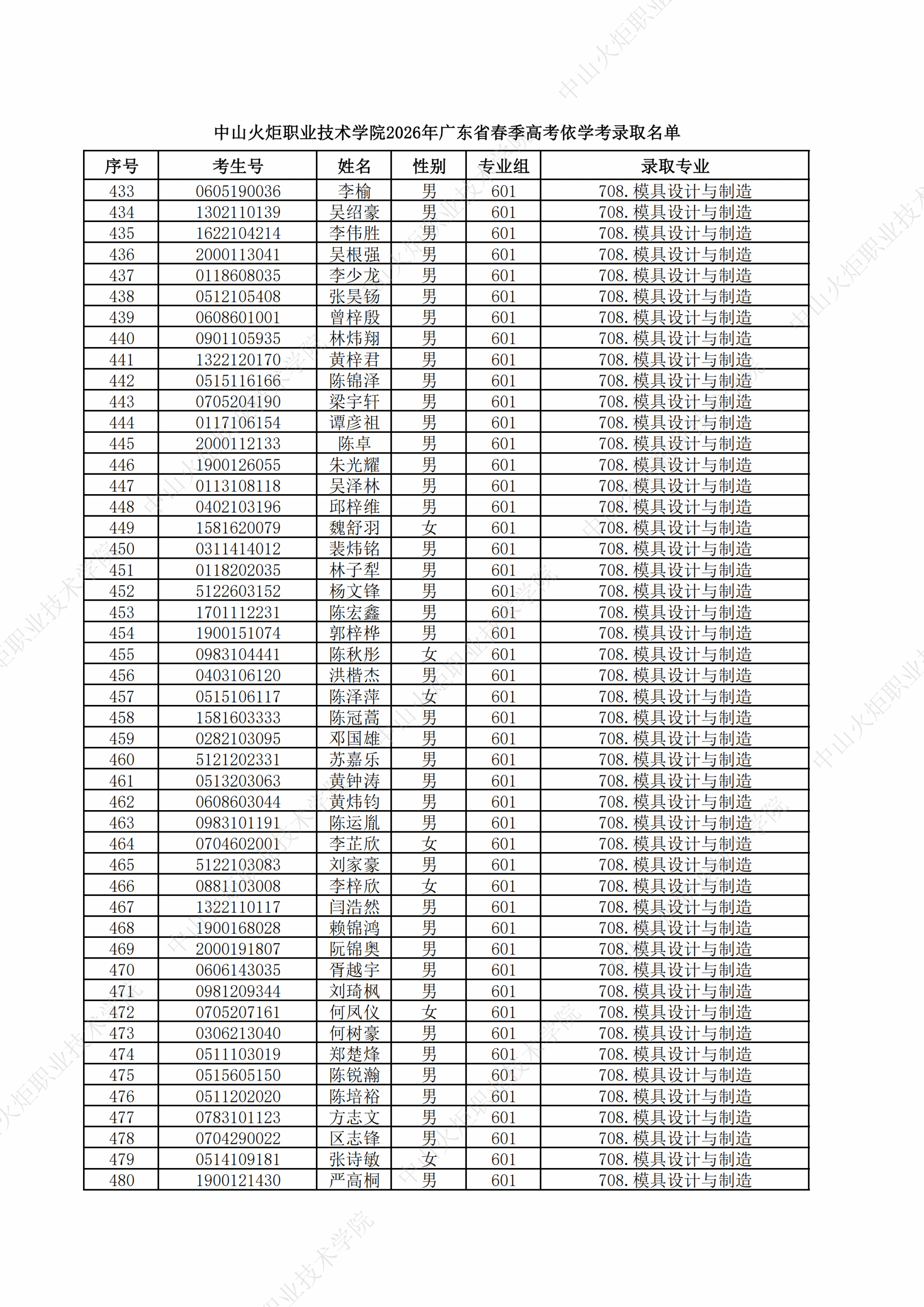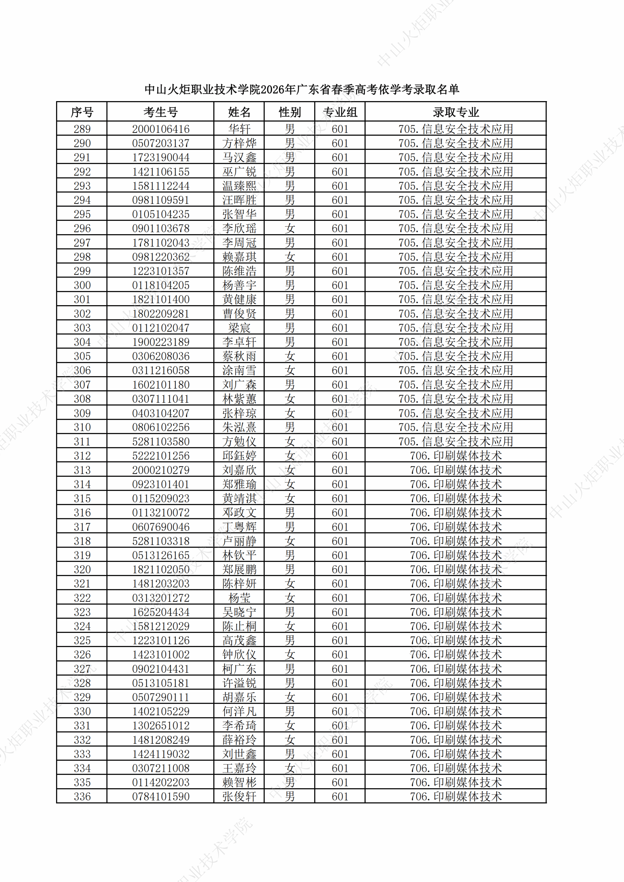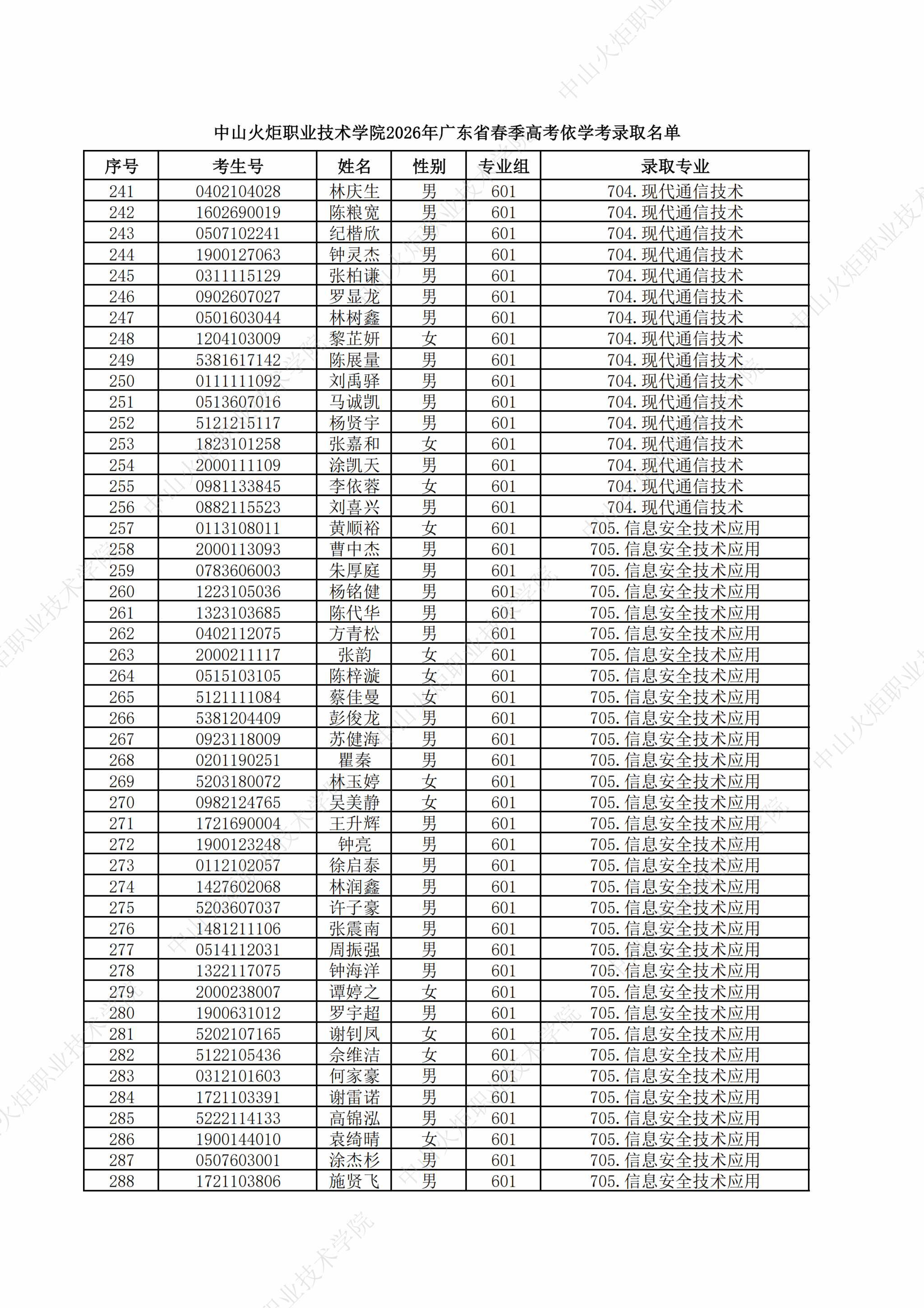 中山火炬职业技术学院2026年春季高考依学考录取名单