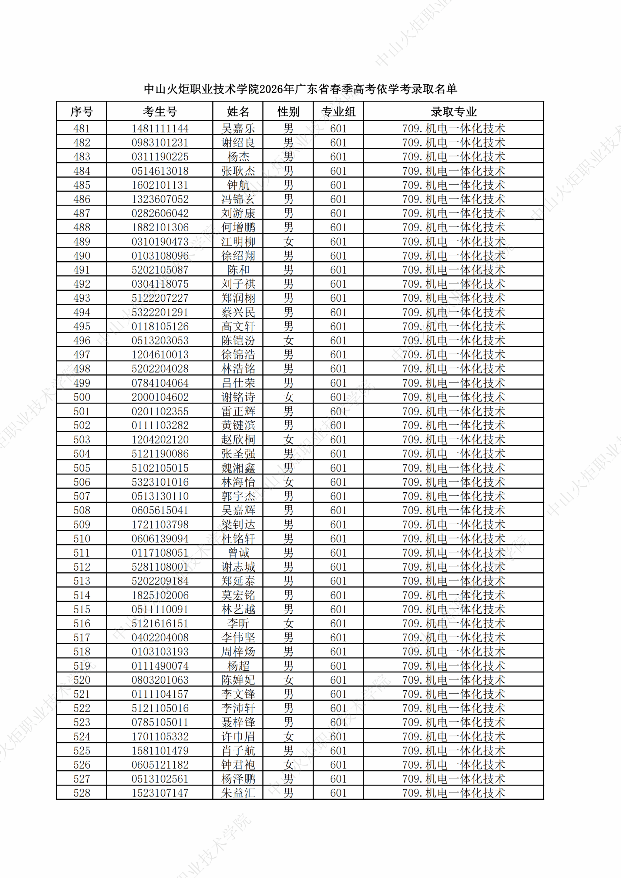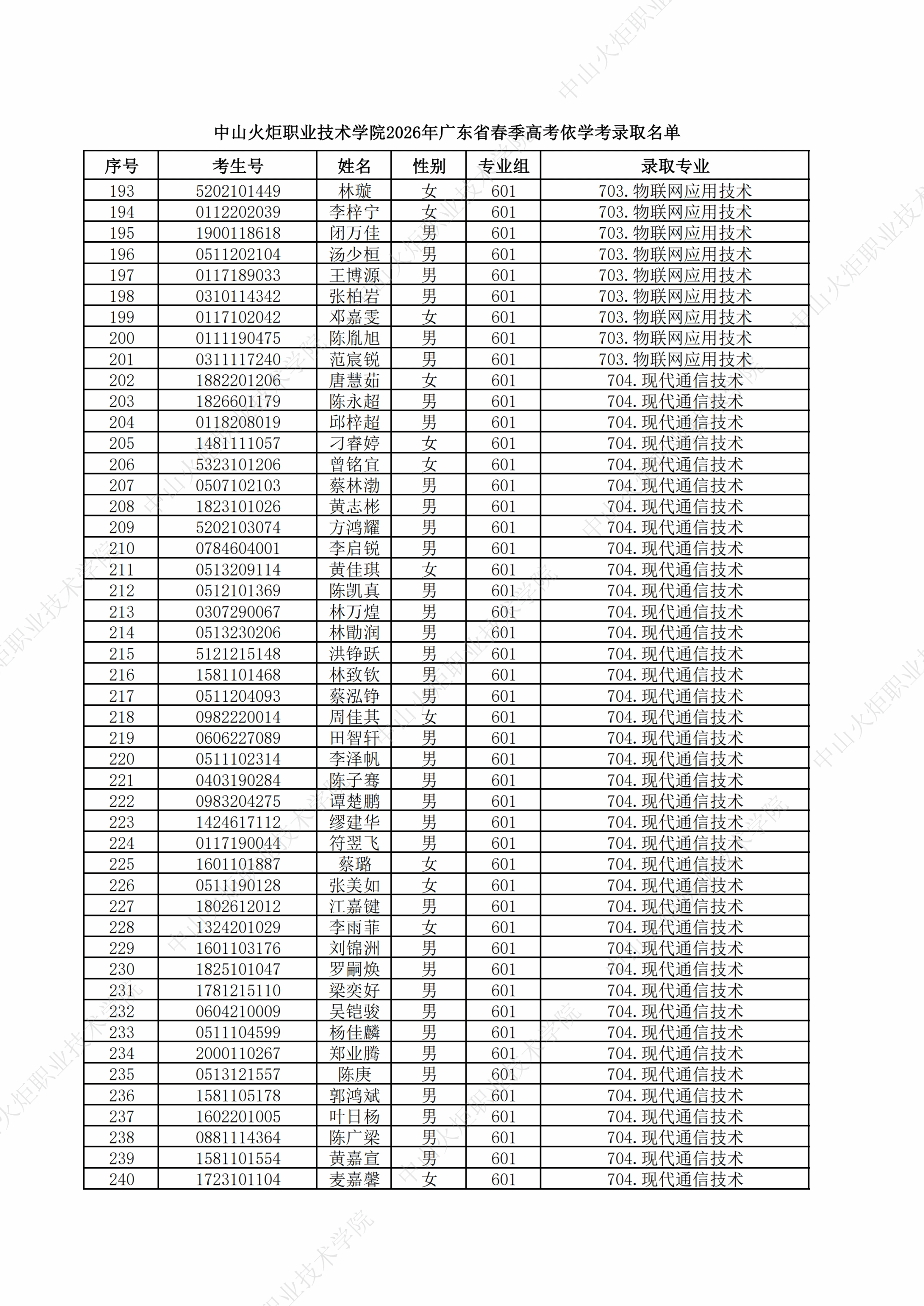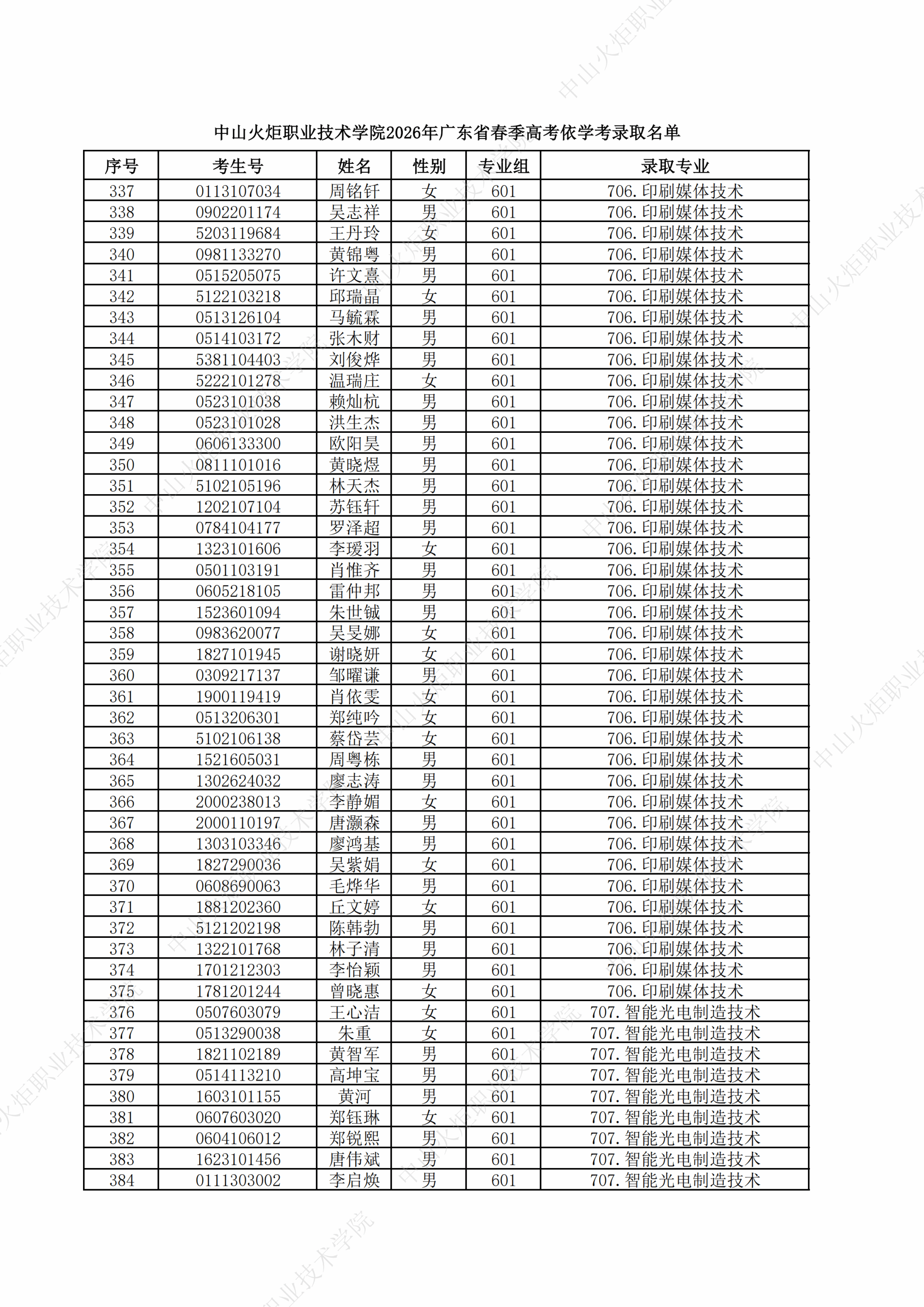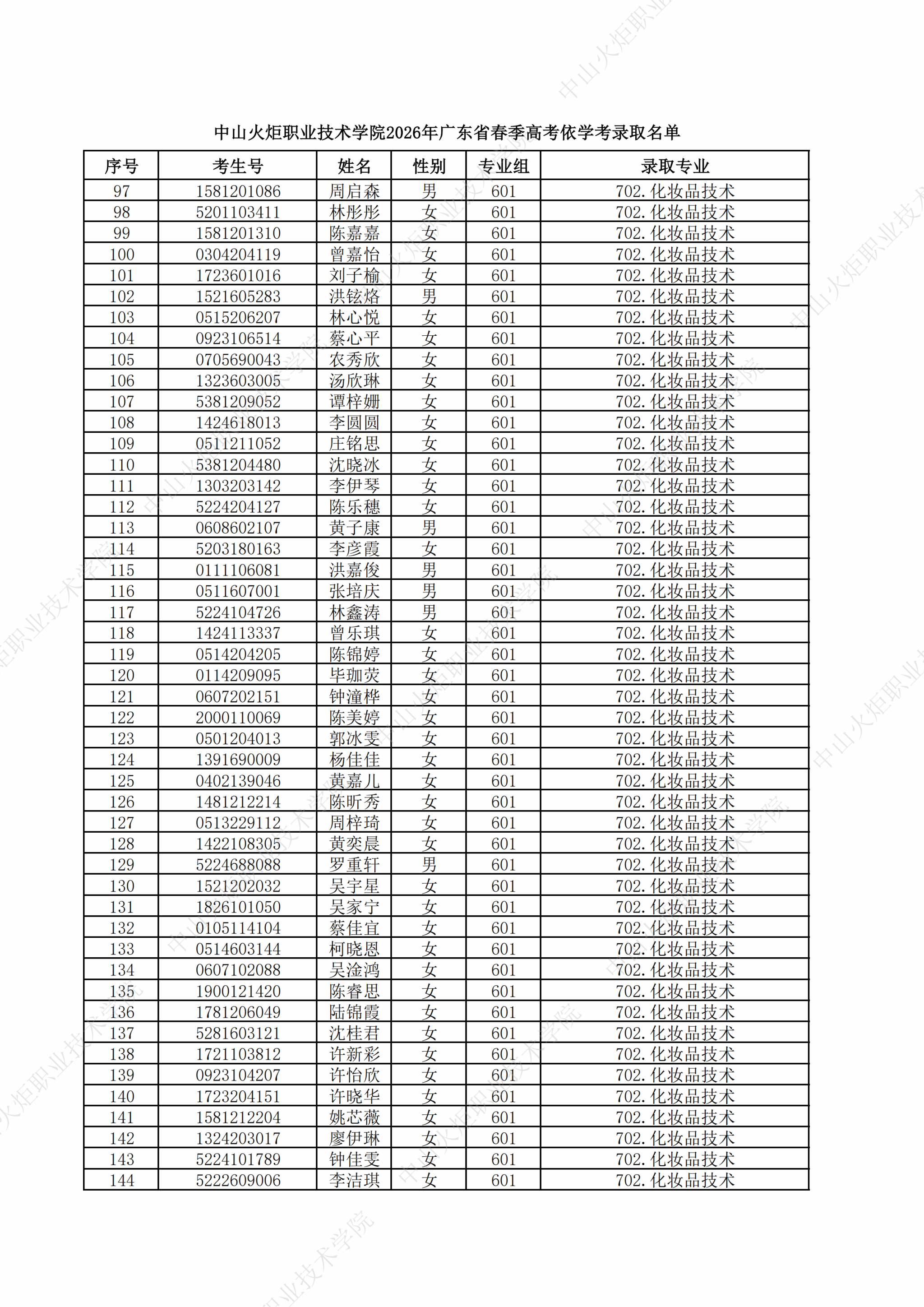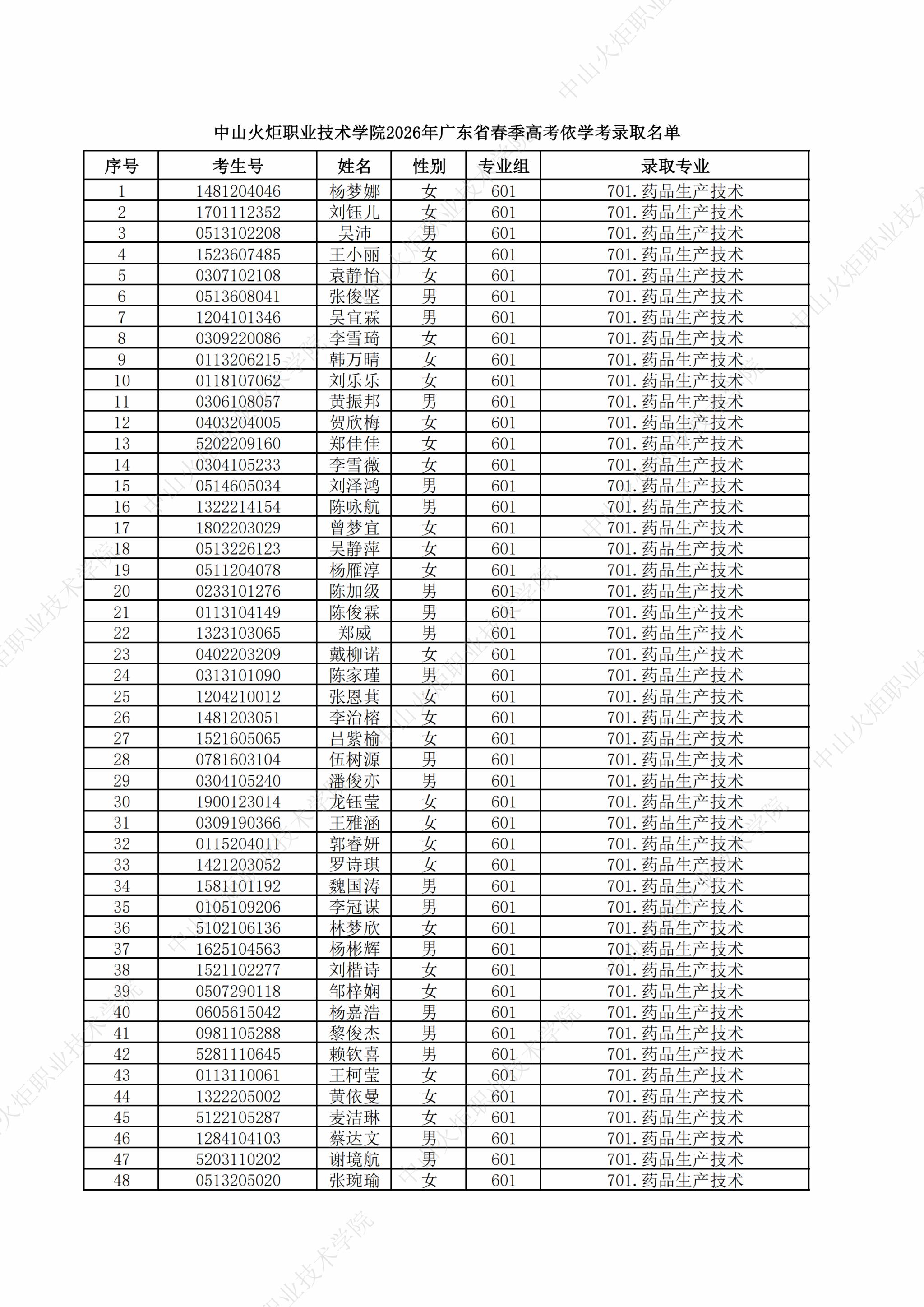 中山火炬职业技术学院2026年春季高考依学考录取名单