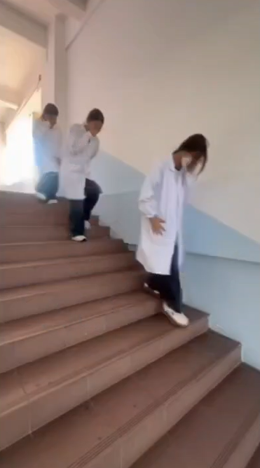 第二部分是“火灾逃生”演练,模拟实验室电路短路引发火情。刺耳的消防警报响起后,学生们在疏导员的指引下,弯腰低姿、用湿毛巾捂住口鼻,沿着预定疏散路线快速、有序地撤离至安全集合点。