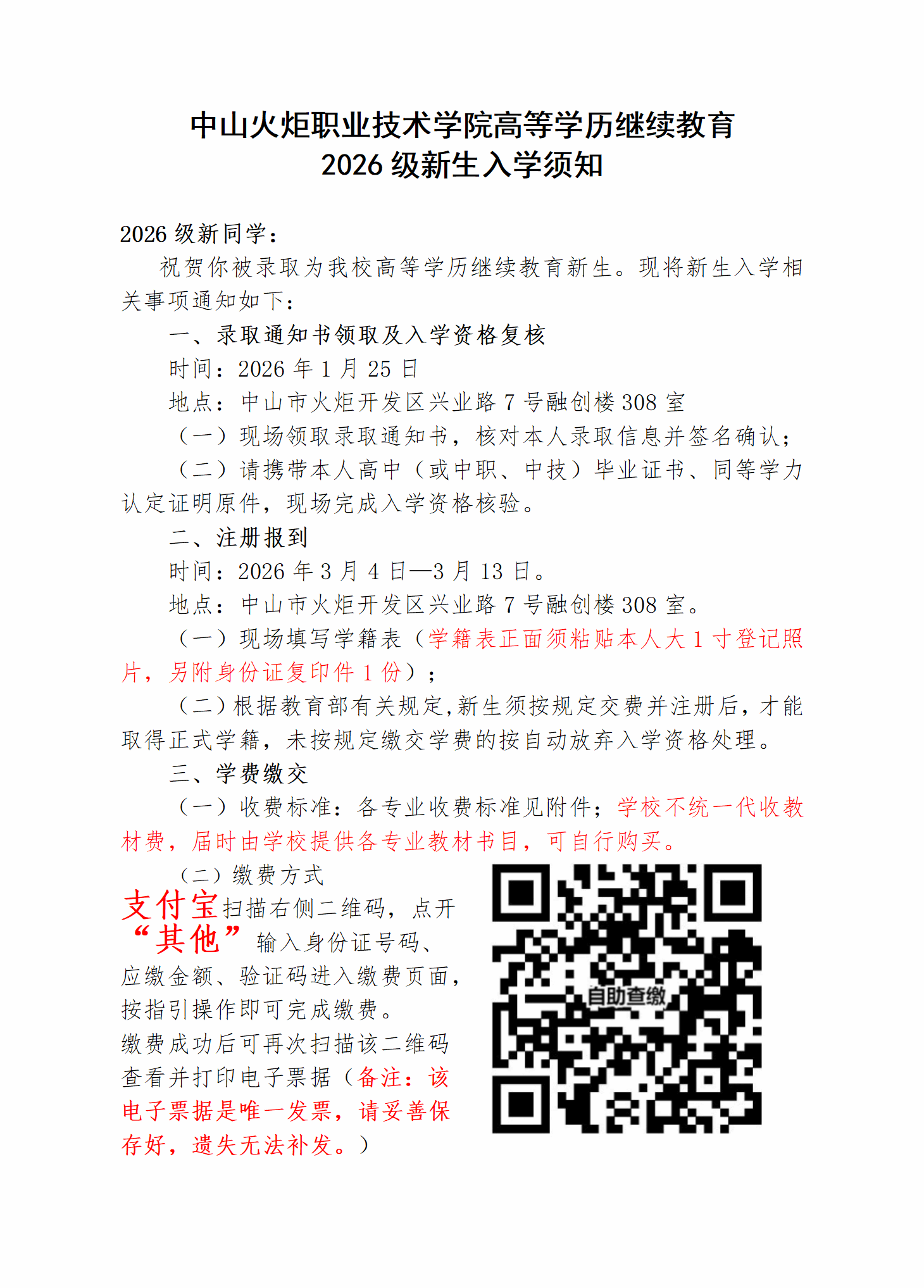中山火炬职业技术学院高等学历继续教育2026级新生入学须知