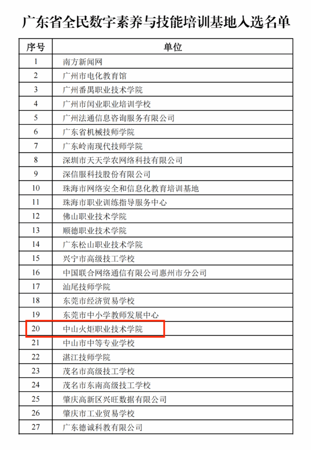 2024年4月28日,中共广东省委网络安全和信息化委员会办公室向社会公示了广东省全民数字素养与技能培训基地入选名单,中山火炬职业技术学院成功入选,成为中山市高职院校中唯一的省级全民数字素养和技能培训基地。
