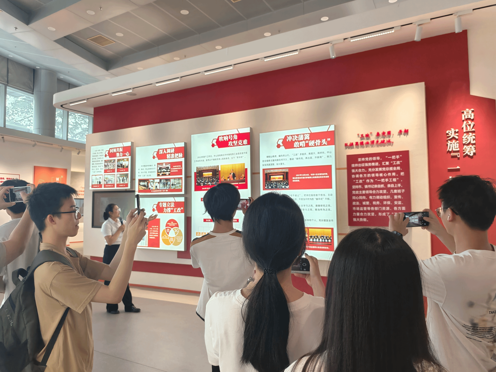在展览厅入口处,师生们拉起“中山火炬职院‘大思政课’实践教学:走进‘百千万工程’中山‘工改’一线”的横幅,以饱满的精神面貌开启研学之旅。在讲解员的引导下,师生们通过详实的图文资料、精细的实景模型、生动的影像记录,系统回顾了中山市破解土地瓶颈、推进村镇低效工业园改造升级的攻坚历程。从昔日“散乱污”园区的旧貌,到今日现代化产业园区的新颜;从“高位统筹、协同攻坚”的顶层设计,到“绿色发展、集约高效”的创新实践,一组组对比数据、一个个鲜活案例,让同学们直观感受到“工改”为中山高质量发展注入的强劲动能与“百千万工程”落地落实的实践伟力。
