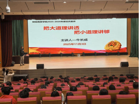 11月3日,为帮助2026届毕业生拓展职业发展渠道,深入了解大学生入伍政策,点燃青年学子参军报国热情,财经商贸学院在学校音乐厅开展2025-2026年度征兵宣讲活动。