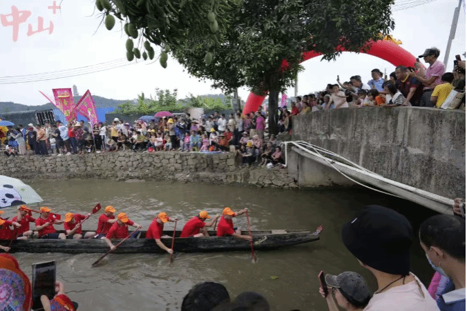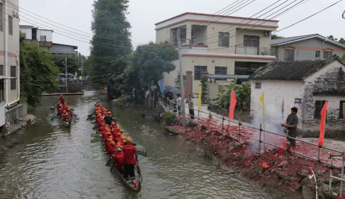 【岸上的村民为龙舟队员加油喝彩】