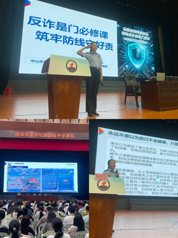 在开学典礼上,中山市公安局火炬开发区分局党员志愿服务队的林海琼警官,带来《反诈是门必修课 筑牢防线守好责》专题讲座。林警官结合实例,生动剖析“杀猪盘”“冒充公检法”等常见诈骗手段,解读《反电信网络诈骗法》,叮嘱新生莫出租、售卖“两卡”,提高警惕,守好自身财产安全 。