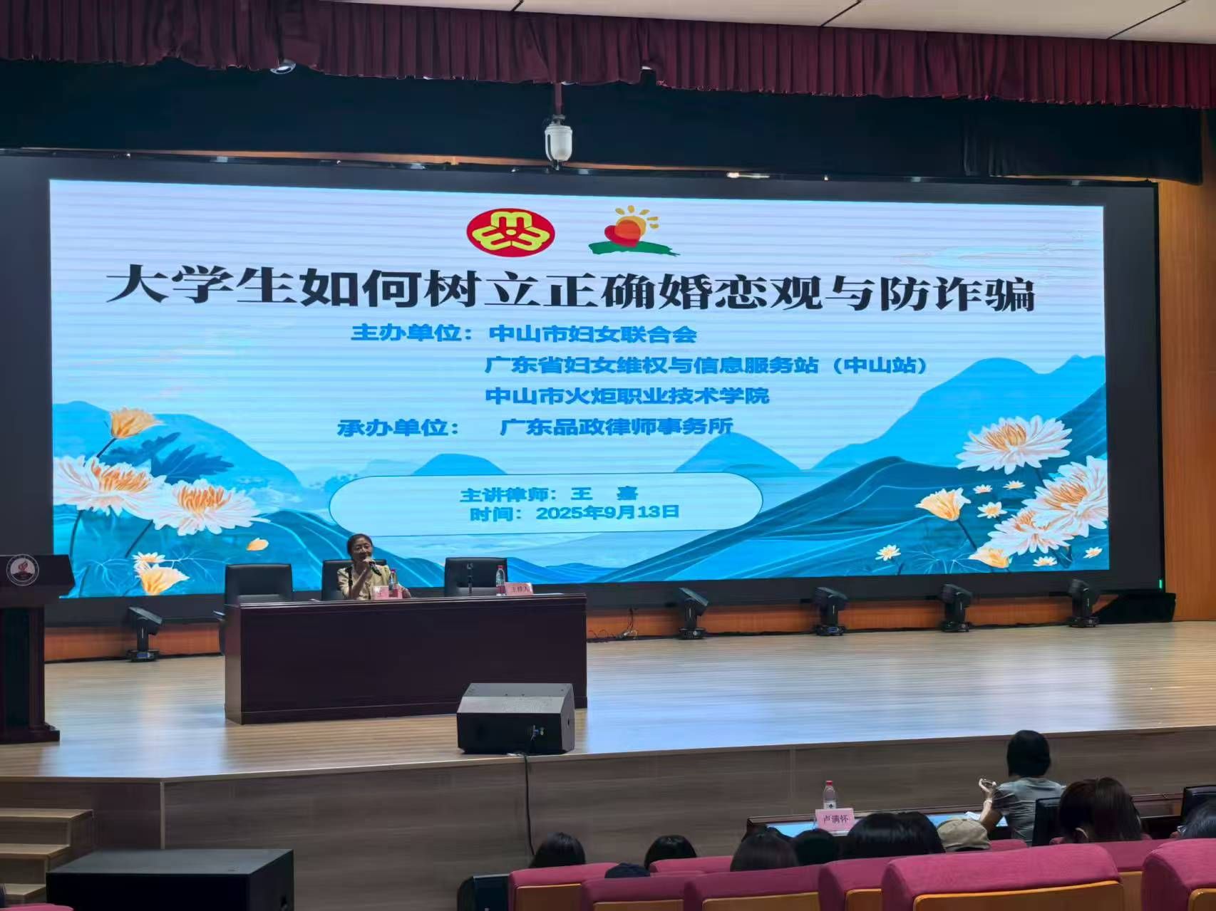 结合中山市妇联2025年“送法入校”活动及“百名法学家百场报告会”,学院特别策划了女生教育活动,特邀广东品政律师事务所律师王嘉女士主讲《如何树立正确婚恋观与防诈骗》专题讲座。此次活动旨在帮助女生们提升自我保护意识和能力,引导她们在大学生活中健康成长、自信生活。