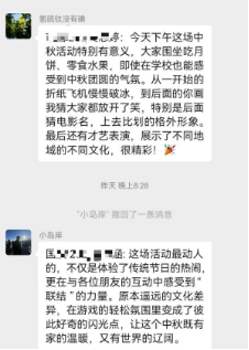 此次“月满金秋,情聚校园”中秋节主题活动,既是学院党建引领校园文化建设的生动实践,也是深化“三全育人”“五育并举”工作要求的具体行动。通过传统文化浸润与温情互动结合,不仅强化了师生对中华优秀传统文化的认同,更以“党建+文化”“党建+服务”的模式,搭建起师生沟通、中外交流的桥梁,切实提升了留校师生的归属感与幸福感。接下来,我院将持续以党建为引领,紧扣学生成长需求,把传统节日活动与思想引领、学风建设、国际交流等学生工作要点深度融合,不断丰富育人载体、创新育人形式,为培养担当民族复兴大任的时代新人和讲好中国故事的国际友人筑牢校园文化根基。
