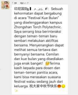 活动接近尾声时,全体师生手持自制灯笼分享感受。来自印度尼西亚的留学生张同学表示首次在异国他乡过中秋很温暖很欣喜,留校学生来自云南的曹同学也感慨学院活动驱散了孤单。
